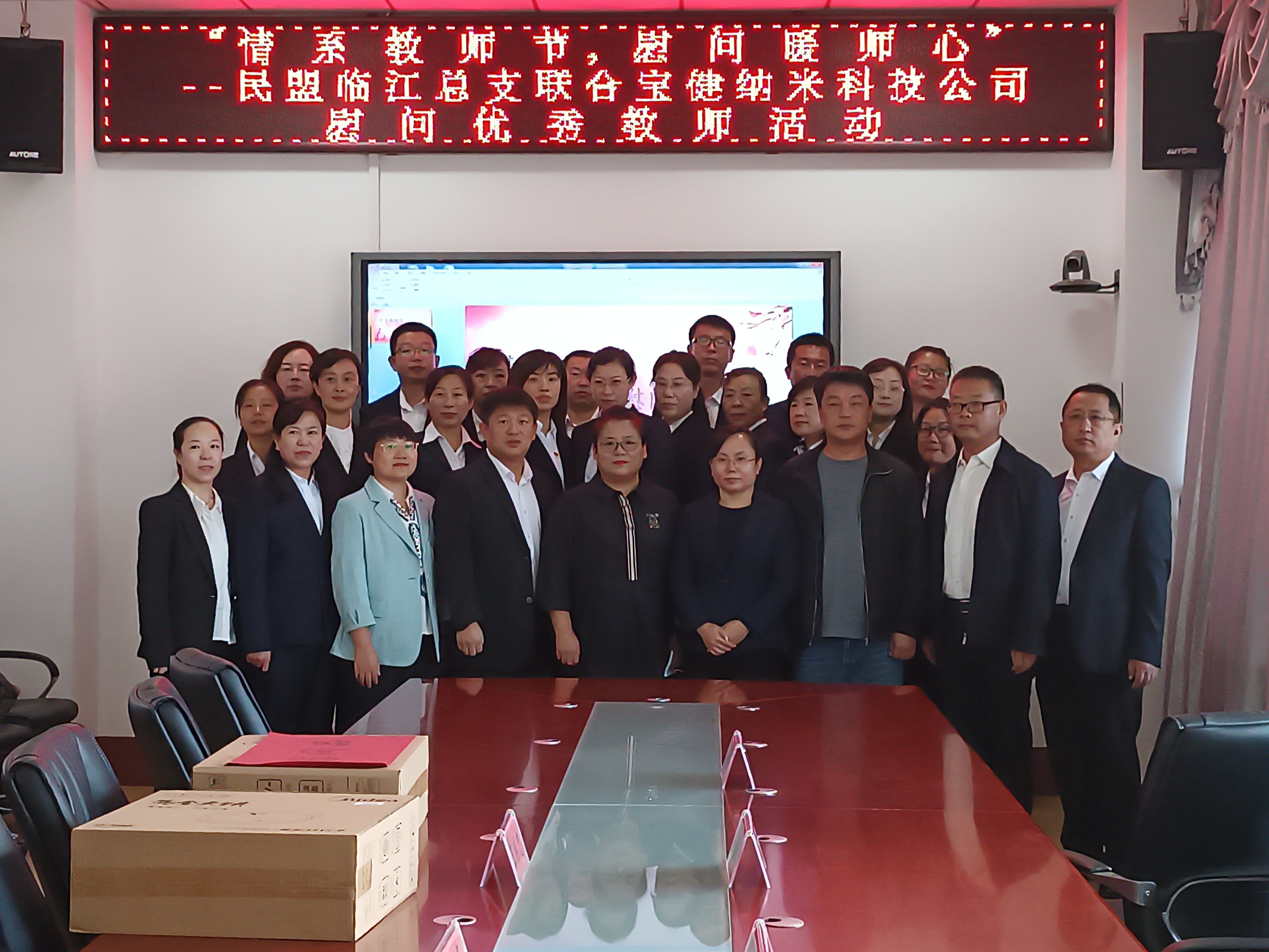 活动中,民盟临江总支班子成员与宝健纳米科技公司负责人向21名市优秀教师、优秀班主任及优秀教育工作者代表发放了慰问品。