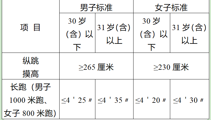 2.体能测评项目及标准。本次招聘体能测评共两项:男子为纵跳摸高、1000米跑;女子为纵跳摸高、800米跑。体能测评标准参照《公安机关录用人民警察体能测评项目和标准(暂行)》执行。